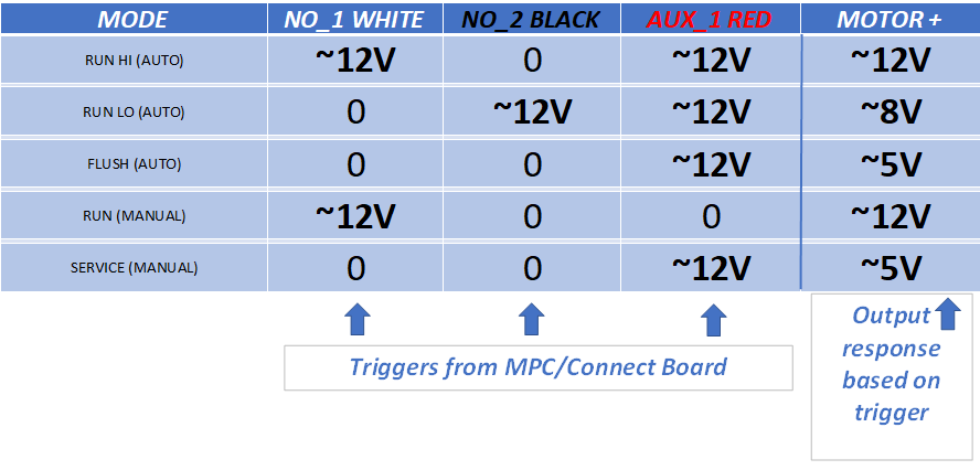 Attached chart is helpful for determining malfunction in a motor speed controller based on its expected values for the trigger wires & motor output. Note that the color coding and terminals can vary depending on system model & generation. Refer to a wiring diagram to confirm your setup.